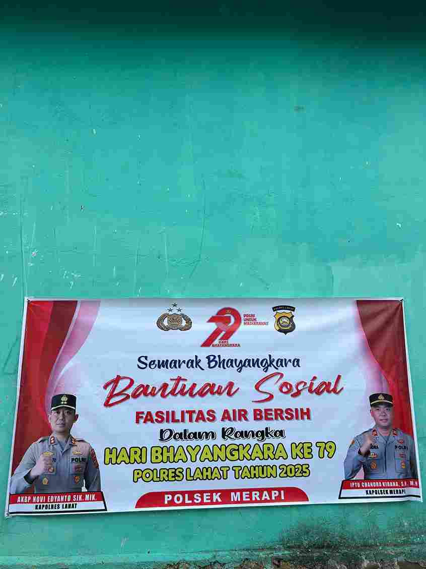 Pranala.news — Kapolres Lahat AKBP SIK, MIK, menyalurkan bantuan sosial (Bansos) berupa fasilitas air bersih dalam rangkaian peringatan HUT Bhayangkara ke-79 tahun 2025, diantaranya melalui Polsek Merapi Barat.
